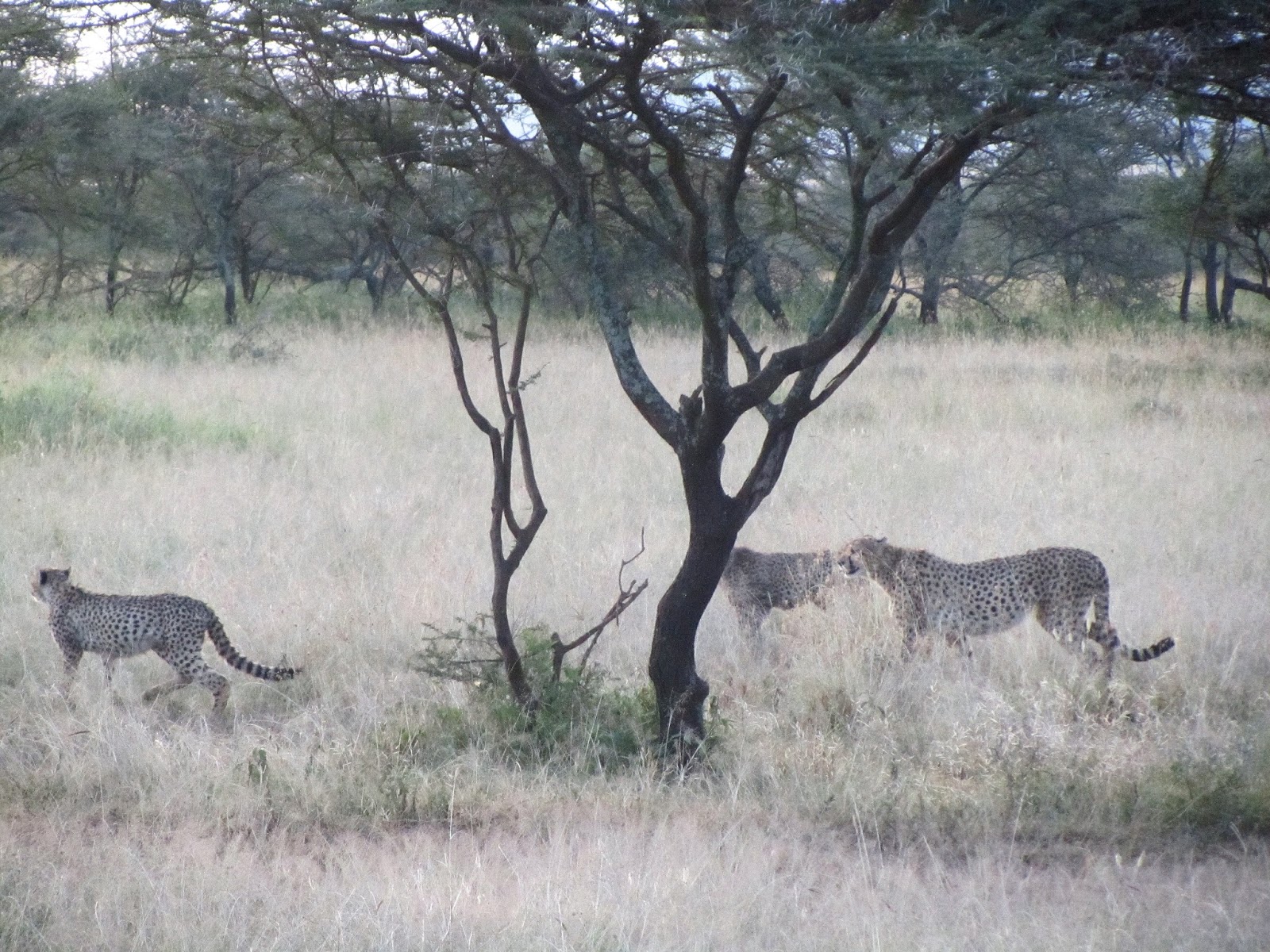 In the midst of Serengeti’s lush grasses there are also areas with trees. In these areas spotting an animal is more likely and this is also where we encountered three cheetahs: mother with its two cubs. As the cheetahs were finishing up their dinner, a large hyena appeared and was threatening one of the cubs. This did not go well with the mother cheetah however….