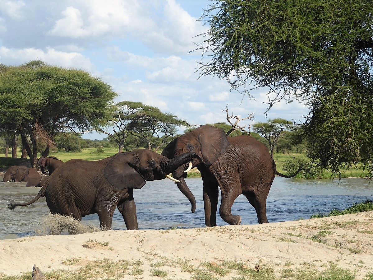Elephants playing at a watering hole in Tanzania